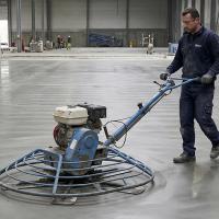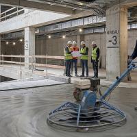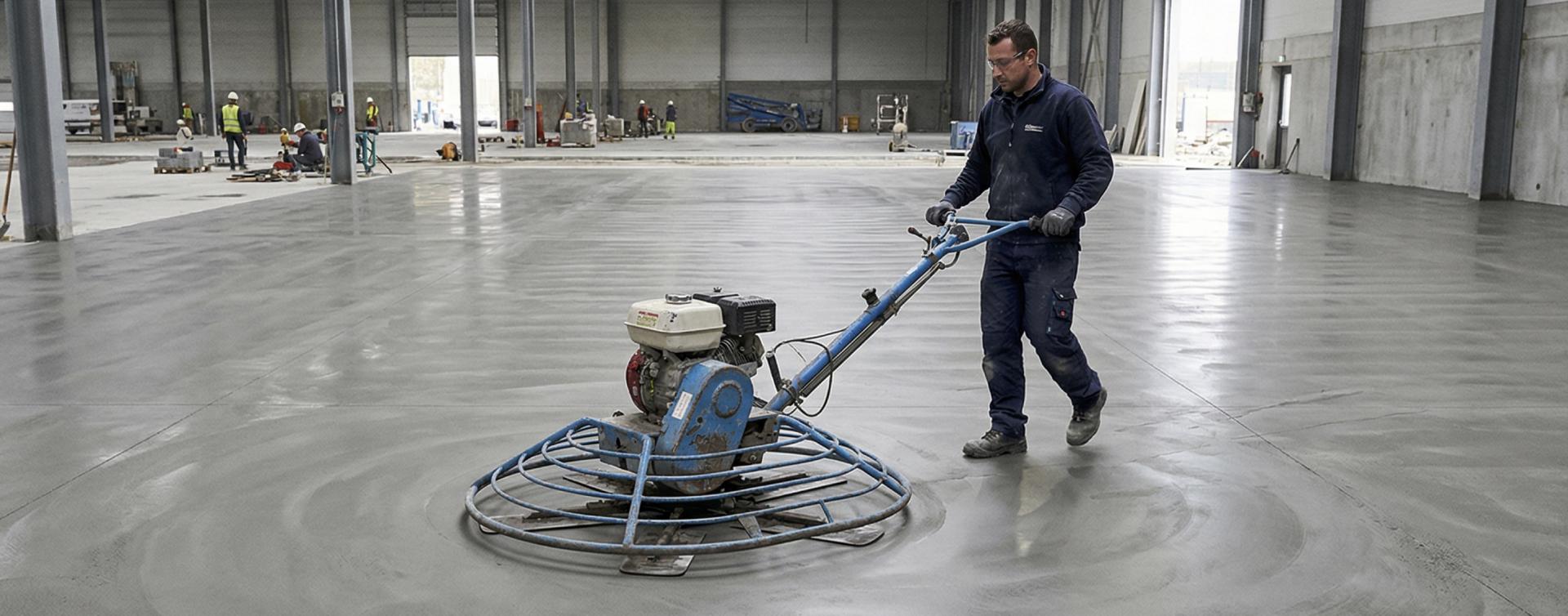 Réalisé à l'aide d'une truelle mécanique (hélicoptère), le béton lissé offre une surface fermée, dense et brillante.