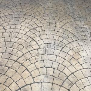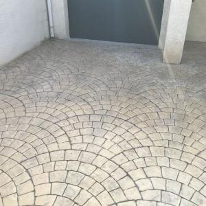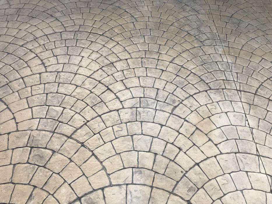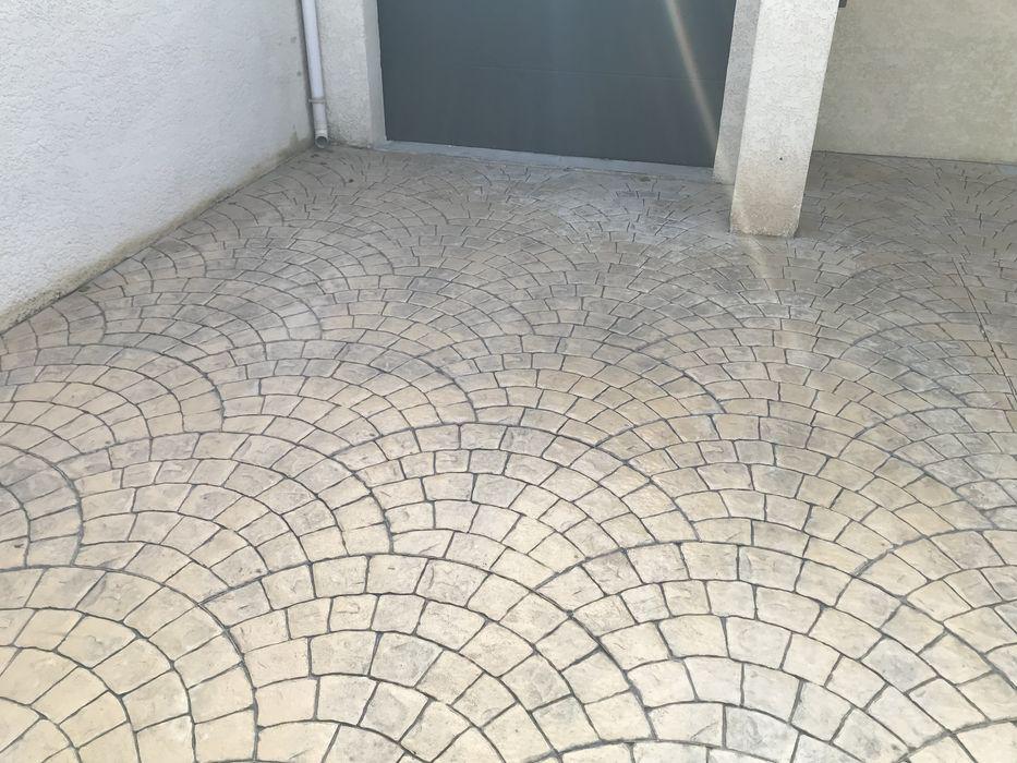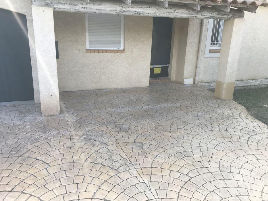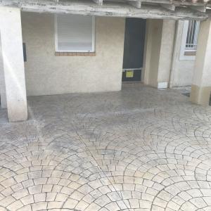 FRANCE REVET GARD a réalisé l'aménagement d'une entrée de villa à Nîmes avec un béton empreinte motif Palmier (éventail). Cette finition artisanale combine le charme des pavés traditionnels et la robustesse d'un sol en béton monolithique.