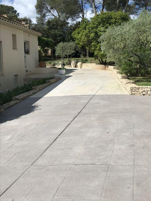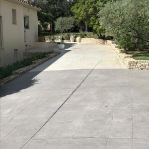 FRANCE REVET GARD a réalisé l'aménagement complet d'une allée de villa à Nîmes. Nous avons mis en œuvre un béton imprimé décoratif imitation grandes dalles, offrant une résistance carrossable exceptionnelle et un rendu visuel haut de gamme.
