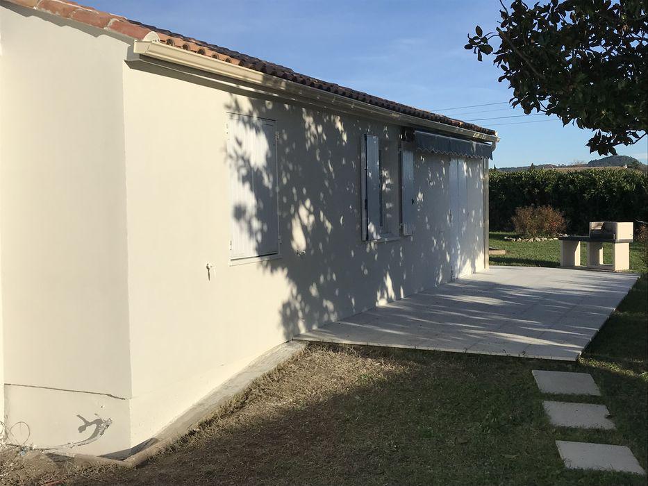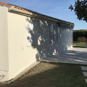 Pour ce projet, le propriétaire a opté pour une finition talochée. Ce travail manuel permet d'obtenir un grain serré et lisse, offrant une esthétique très contemporaine. À Saint-Quentin-la-Poterie, cette finition est idéale car elle limite l'accroche de la poussière et facilite l'entretien de la façade.